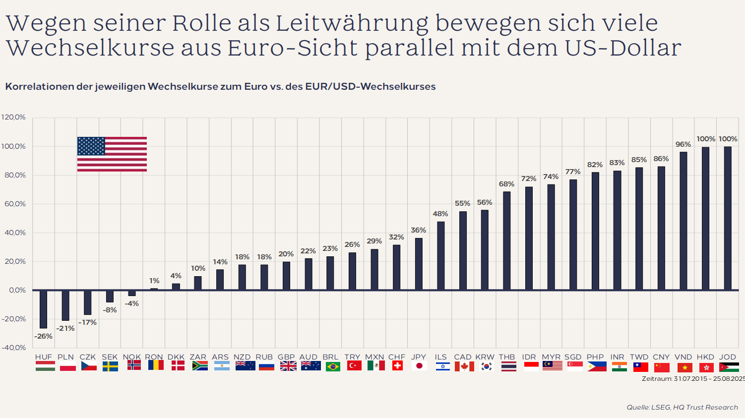 Die Dominanz des US-Dollar prägt den globalen Devisenhandel auf besondere Weise. In einer aktuellen Analyse untersucht Pascal Kielkopf von HQ Trust, wie sich Veränderungen im Wechselkurs zwischen Euro und US-Dollar auch in anderen Währungen widerspiegeln – und welche davon besonders eng mit dem Dollar laufen.