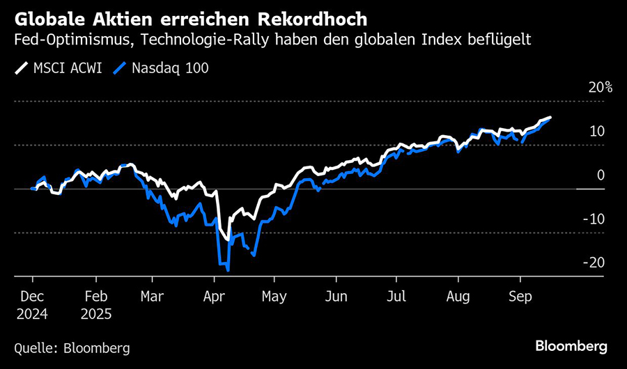 Der MSCI All Country World Index hat neue Rekordhöhen erreicht. Grund ist die anhaltende Begeisterung für künstliche Intelligenz, die vor allem Technologieriesen antreibt. Zudem fielen die Auswirkungen der umfassenden US-Zölle bisher geringer aus als befürchtet. Anleger setzen außerdem darauf, dass die Federal Reserve rechtzeitig mit Zinssenkungen beginnen wird, um eine Rezession abzuwenden.