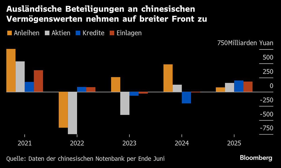 In der ersten Jahreshälfte stockten ausländische Investoren ihre Bestände an Onshore-Aktien, Anleihen, Krediten und Einlagen massiv auf – ein gleichzeitiger Zuwachs, wie er zuletzt 2021 beobachtet wurde. Laut Daten der People’s Bank of China lagen die Nettozuflüsse bis Juni rund 60 Prozent über dem Gesamtwert des Jahres 2024. Dieser Trend dürfte sich fortgesetzt haben. "Ausländische Investoren haben im August Onshore-Aktien und -Anleihen per saldo insgesamt gekauft”, erklärte Li Bin, Vizedirektor der Devisenaufsicht SAFE, bei einem Briefing Anfang des Monats.