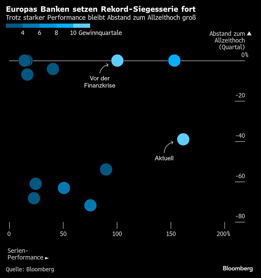 Der Stoxx Europe 600 Banks Index hat das zwölfte Quartal in Serie zugelegt – ein historischer Lauf. Mit einem Plus von 47 Prozent seit Jahresbeginn führen Banken die Rally am europäischen Aktienmarkt an, auch wenn das Allzeithoch noch in weiter Ferne liegt.