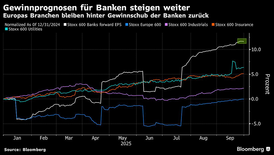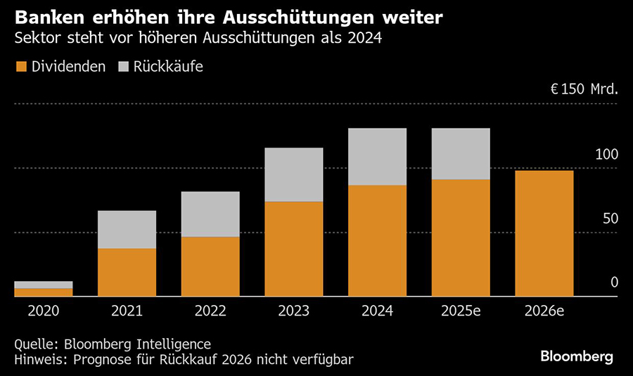 Mit dem Start der Berichtssaison am 22. Oktober durch Unicredit rücken Gebühreneinnahmen, Rückstellungen und Geschäftsmodelle in den Fokus. Banken mit starker Investmentbanking-Sparte könnten zusätzlich profitieren. Ausschüttungen bleiben ein zentrales Thema – "Bloomberg Intelligence" rechnet mit erneut überdurchschnittlichen Dividenden.