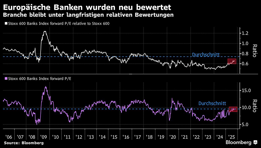 Mit einem erwarteten KGV von rund zehn gelten Banken nicht mehr als Schnäppchen, bleiben aber im Vergleich zum Gesamtmarkt attraktiv. Der Abschlag zum Stoxx 600 beträgt rund ein Drittel.
