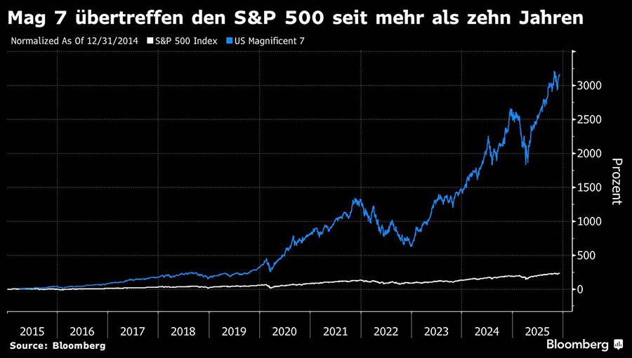 Ein Index der "Magnificent Seven"-Aktien – darunter Nvidia, Meta Platforms und Alphabet – hat seit Ende 2019 mehr als 600 Prozent zugelegt, während der S&P 500 um 113 Prozent gestiegen ist. Der Trend wurde sowohl durch die pandemiebedingte Hinwendung zu Big Tech als auch durch den jüngsten Boom bei künstlicher Intelligenz begünstigt.