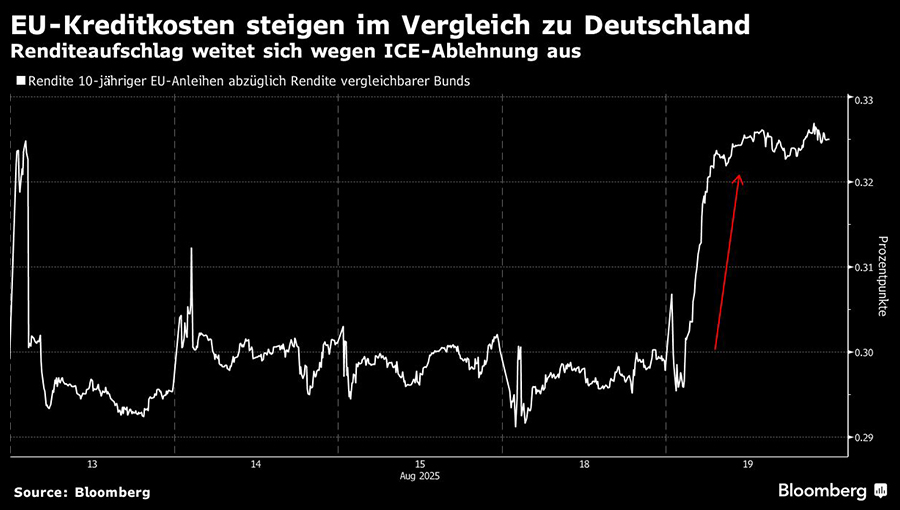 Nach Bekanntwerden der ICE-Entscheidung am Dienstag (19.8.) gaben die Kurse von EU-Anleihen nach. Die Rendite der zehnjährigen Papiere stieg um bis zu vier Basispunkte – der größte Tagesanstieg der Risikoprämie gegenüber deutschen Bundesanleihen seit mehr als einem Jahr.
