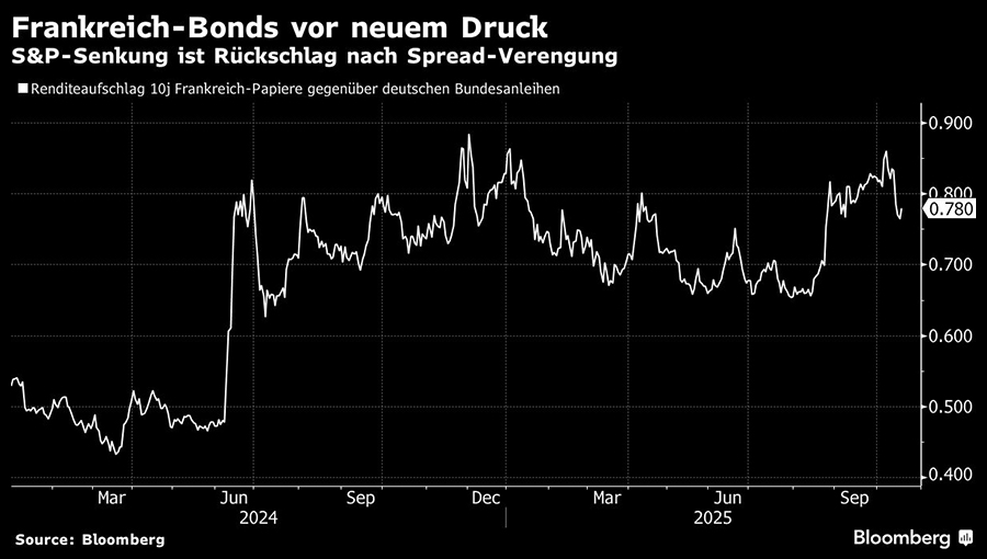 Die Kurse französischer Anleihen haben nach der Herabstufung der Staatsbonität durch die Ratingagentur S&P nachgegeben. Der Schritt, der am Freitagabend (17.10.) bekannt wurde, kam überraschend und unterstreicht die angespannten Finanzen Frankreichs sowie das politische Risiko vor den Präsidentschaftswahlen 2027.