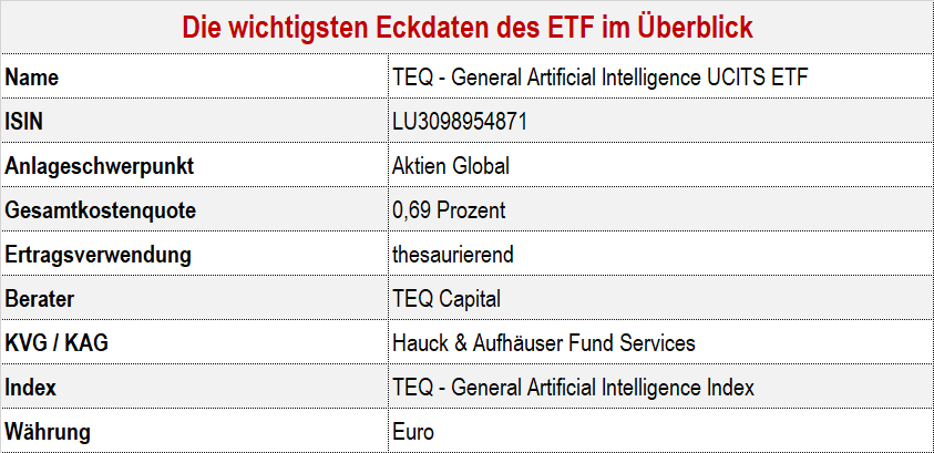 Die auf Technologiewerte spezialisierte Fondsboutique TEQ Capital startet ihr erstes börsengehandeltes Produkt, den TEQ – General Artificial Intelligence UCITS ETF. Der ETF, der eine Gesamtkostenquote von 0,69 Prozent hat, bildet passiv den TEQ – General Artificial Intelligence Index ab, der bereits seit dem 17. Dezember 2024 aktiv ist und seitdem rund 29 Prozent Performance geliefert hat. Das teilt die Gesellschaft des bekannten Wagniskapitalinvestors Frank Thelen mit. Mit dem Indextracker sollen private wie institutionelle Anleger vom Potenzial der Entwicklung bei allgemeiner künstlicher Intelligenz (General Artificial Intelligence, General AI) profitieren können.