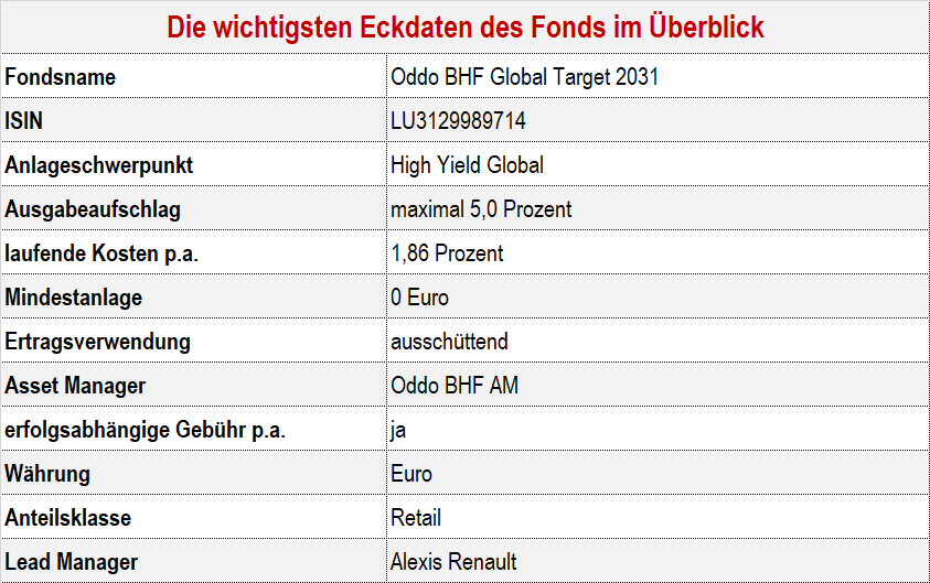 Oddo BHF Asset Management hat mit dem Oddo BHF Global Target 2031 einen weiteren Laufzeitfonds aufgelegt, wie die Gesellschaft mitteilt. Der Fonds, der im Gegensatz zu seinen Vorgängern bis zum Laufzeitende am 31. Dezember 2031 gezeichnet werden kann, investiert in ein breit gestreutes Portfolio aus globalen hochverzinslichen Anleihen mit Ratings zwischen "BB+" und "CCC" sowie maximaler Laufzeit bis 1. Oktober 2032.