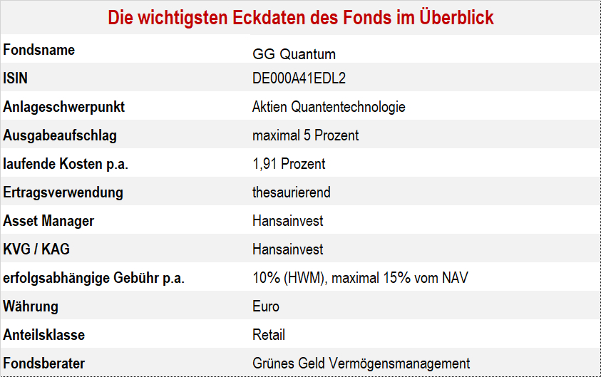 Die Grünes Geld Vermögensmanagement hat zusammen mit der Service-Kapitalverwaltungsgesellschaft Hansainvest den Aktienfonds GG Quantum aufgelegt – Details unten. Das Portfolio soll privaten und institutionellen Anlegern ermöglichen, gezielt in Unternehmen aus dem Bereich Quantentechnologie zu investieren. Das geht aus einer Pressemitteilung hervor. Für den Vertrieb des Fonds ist die Vertriebsgesellschaft Punica Invest zuständig, an der die Hansainvest beteiligt ist.