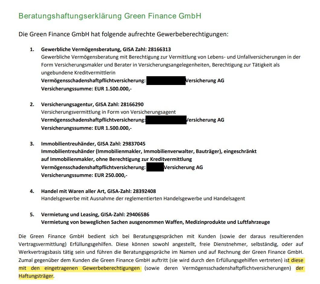 Dass man seine Pflichten selbst kennen muss und sich niemals auf fremde Angaben verlassen darf, zeigt ein weiteres Dokument, in dem die Green Finance GmbH eine Beratungshaftungserklärung abgibt. Es stammt aus dem Jahr 2017, illustriert aber den springenden Punkt, auf den Vermittler achten müssen: Für die selbstständigen Berater ist so ein Papier wertlos, da wie beschrieben je nach Finanzprodukt entweder ein eigenes Gewerbe nötig ist oder zusätzlich ein Haftungsdach (und das kann nicht irgendeine juristische Person sein). Dass Green Finance eine solche Konzession hat oder hatte, ist nicht ersichtlich. Das Unternehmen gab dazu auf Anfrage keine Auskunft. Da man mit Rechtsexperten zusammenarbeite, gehe man davon aus, "korrekt und gesetzeskonform" gehandelt zu haben, heißt es nur.