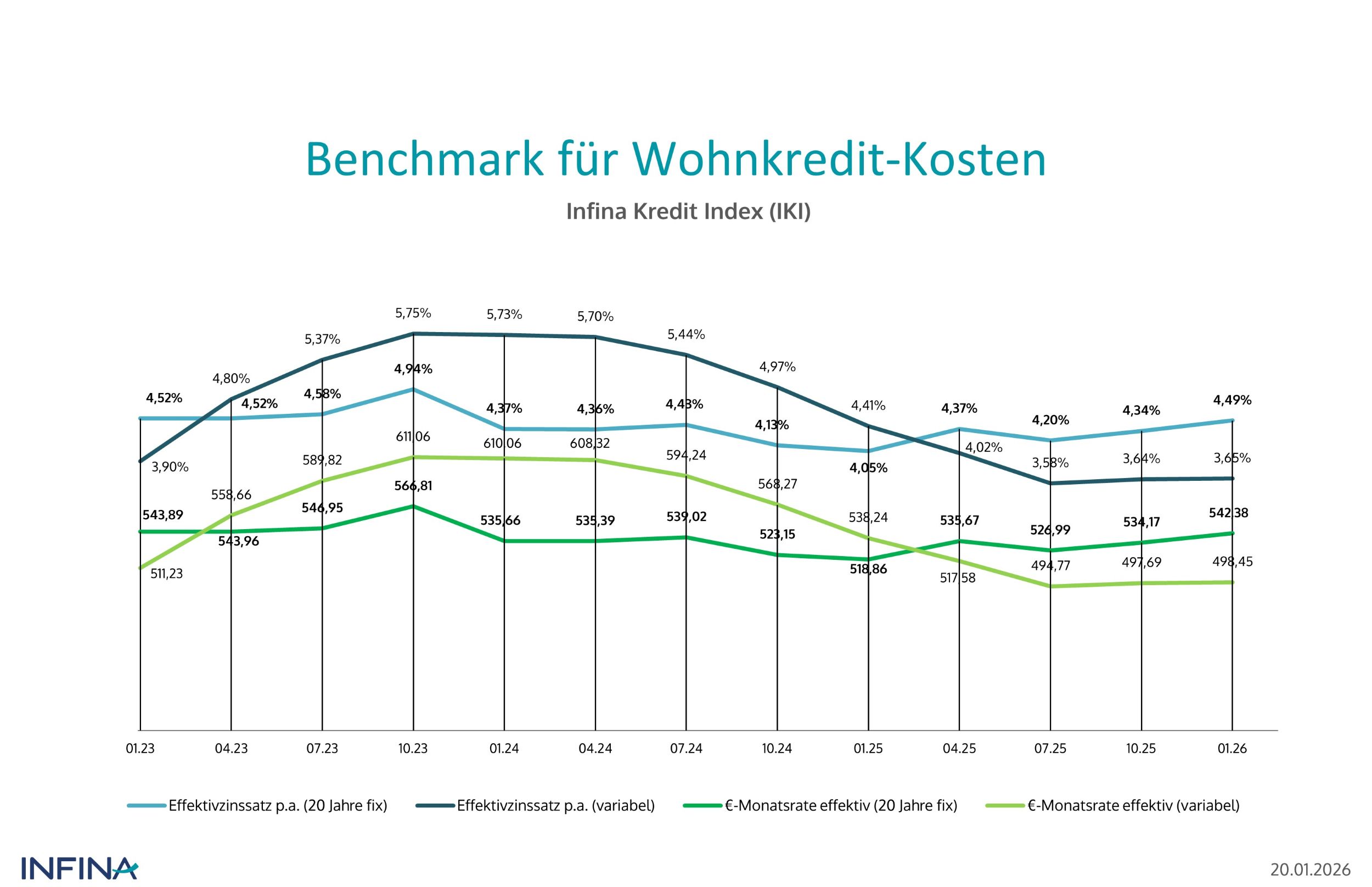 Im letzten Quartal 2025 sind die Zinsen für Wohnkredite in Österreich leicht gestiegen. Das zeigt der vierteljährlich erhobene Infina Kredit Index (IKI). Rund 3,95 Prozent zahlt man nominal, 4,49 Prozent effektiv für einen exemplarischen Kredit über 100.000 Euro mit 20 Jahren Fixbindung bei 25 Jahren Laufzeit. Ein leichter Anstieg zum Vorquartal und eine Annäherung an Werte von 2023. Damals allerdings befand sich die Eurozone noch in einer Zinssteigerungsphase.