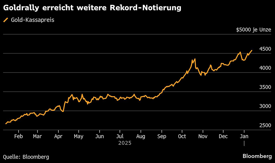 Im frühen Montagshandel (12.1.) kostete die Feinunze Gold in der Spitze 4.599,87 Dollar – rund zwei Prozent mehr als am Freitagabend. Silber verteuerte sich zeitweise um bis zu 5,8 Prozent auf 84,60 US-Dollar je Unze. Das vorherige Rekordhoch vom 29. Dezember hatte bei 84,01 Dollar gelegen.