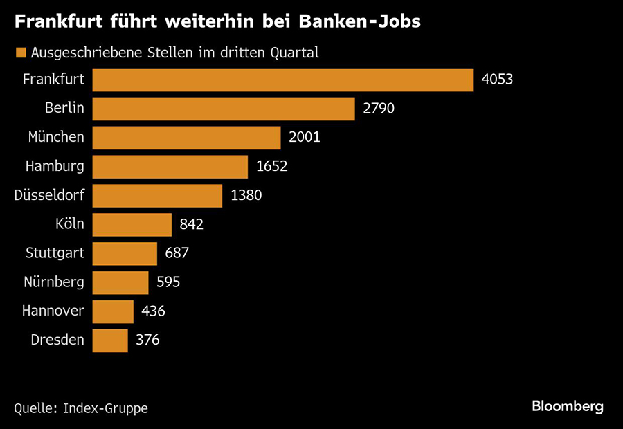 Laut den Daten gab es in Frankfurt im dritten Quartal gut 4.000 ausgeschriebene Stellen. Dahinter folgten Berlin, wo viele Fintech-Unternehmen zuhause sind, mit knapp 2.800 Jobs, sowie München mit rund 2.000 Stellen. In Hamburg und Düsseldorf wurden ebenfalls jeweils mehr als 1.000 Jobs ausgeschrieben.