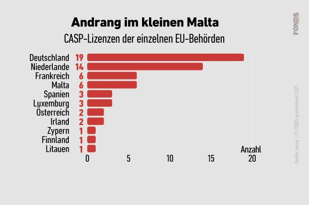 Wenn man auf die bisher vergebenen CASP-Lizenzen blickt, sticht eine Auffälligkeit ins Auge. Sehr beliebt bei Antragstellern ist das kleine Malta. Das Land mit nur rund einer halben Million Einwohnern hat genau so viele Lizenzen vergeben wie das große Frankreich. Eine Grafik der Redaktion mit Daten der europäischen Marktaufsicht ESMA per 19. September 2025 zeigt die Behördentätigkeit in den einzelnen Ländern.