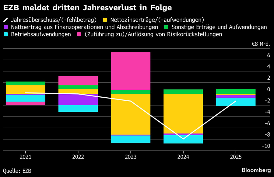 Das Defizit für 2025 belief sich auf 1,3 Milliarden Euro, wie die EZB am Donnerstag (26.2.) mitteilte. Damit fiel der Fehlbetrag deutlich geringer aus als der Rekordverlust von 7,9 Milliarden Euro im Vorjahr.