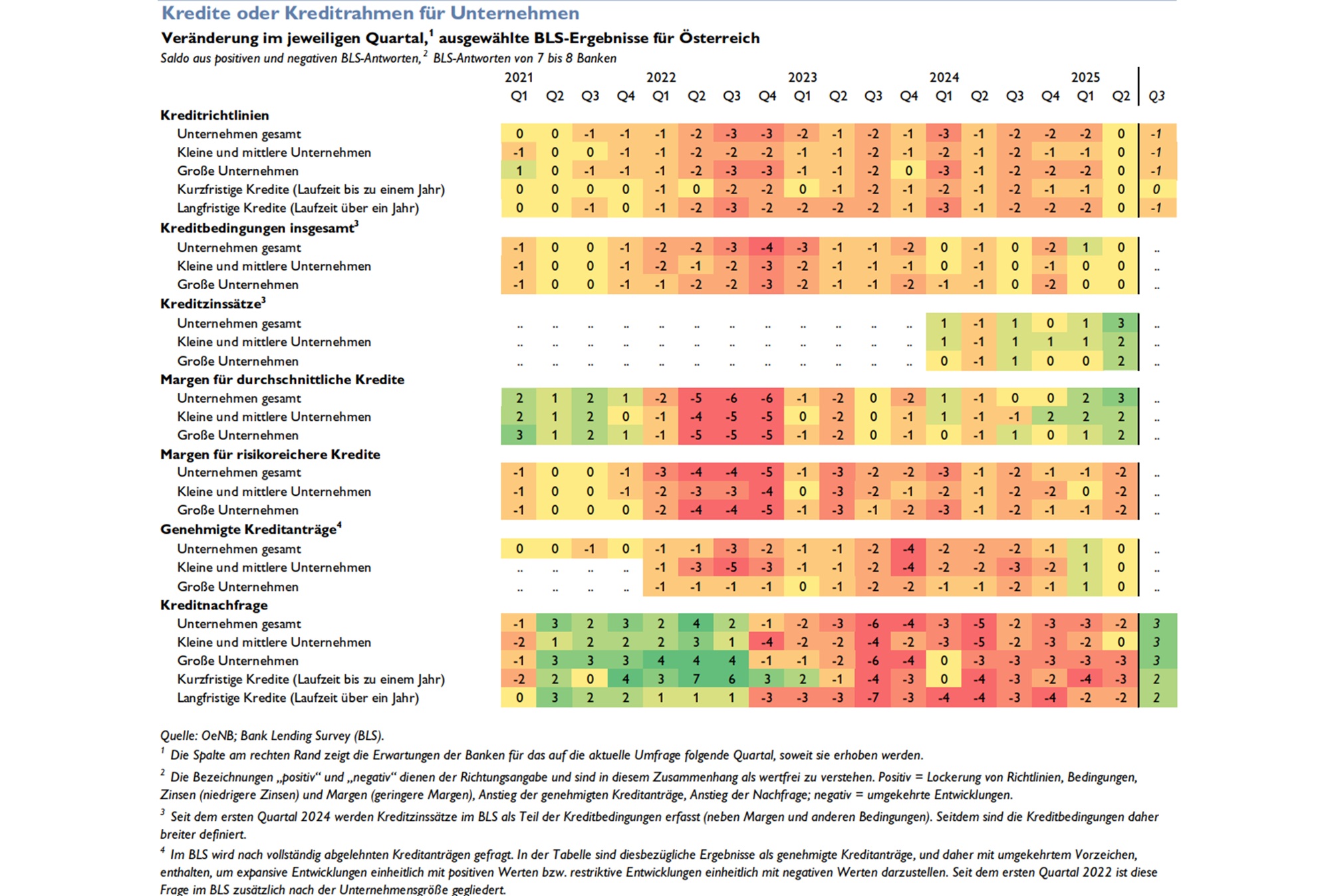 Angesichts der Rezession und der unberechenbaren US-Zollpolitik gibt es bei den Unternehmen weniger Finanzierungsbedarf für neue Anlagen. Umgekehrt haben die Banken wegen der sich verschlechternden Kreditwürdigkeit der Betriebe ihre Angebotspolitik verschärft. Die befragten Institute bleiben dennoch erneut vorsichtig optimistisch und erwarten nun für das dritte Quartal 2025 einen Anstieg der Nachfrage nach Unternehmenskrediten.