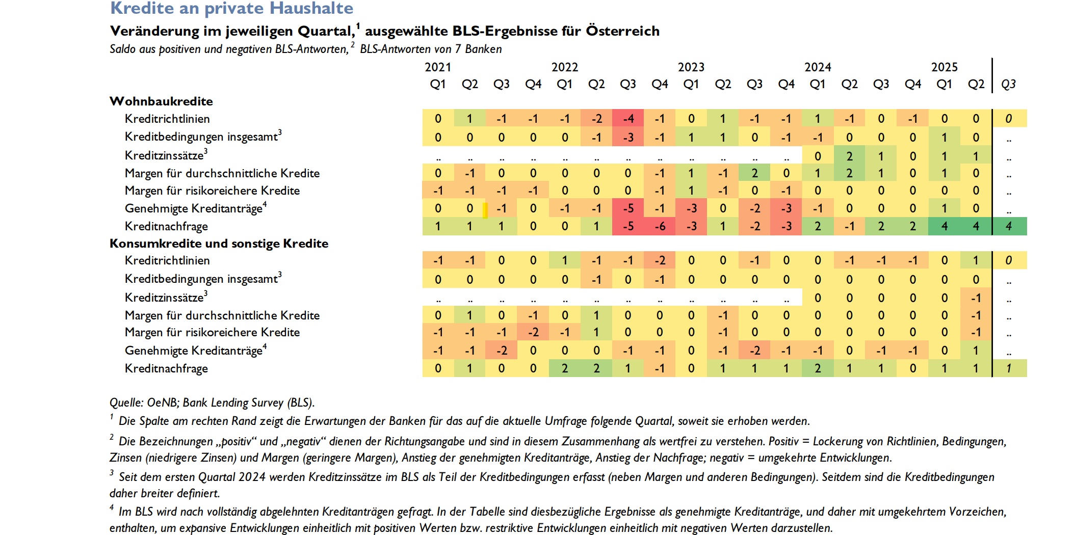 Ernüchternd ist nach wie vor die Kreditnachfrage der österreichischen Unternehmen. Sie ist laut Umfrage im zweiten Quartal 2025 abermals zurückgegangen, obwohl in der letzten Umfrage eine Trendwende erwartet worden war. Der Rückgang hält bereits seit Ende 2022 an.